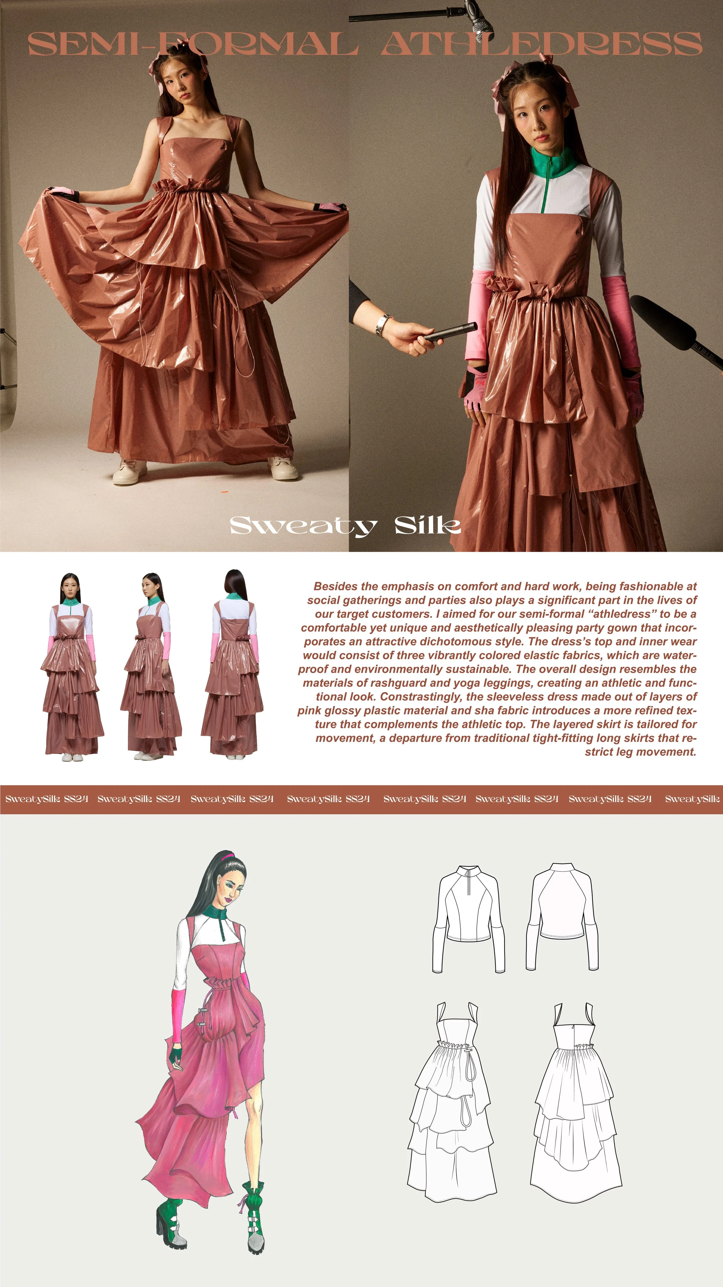 Besides the emphasis on comfort and hard work, being fashionable at social gatherings and parties also plays a significant part in the lives of our target customers. I aimed for our semi-formal “athledress” to be a comfortable yet unique and aesthetically pleasing party gown that incorporates an attractive dichotomous style. The dress’s top and inner wear would consist of three vibrantly colored elastic fabrics, which are waterproof and environmentally sustainable. The overall design resembles the materials of rashguard and yoga leggings, creating an athletic and functional look.