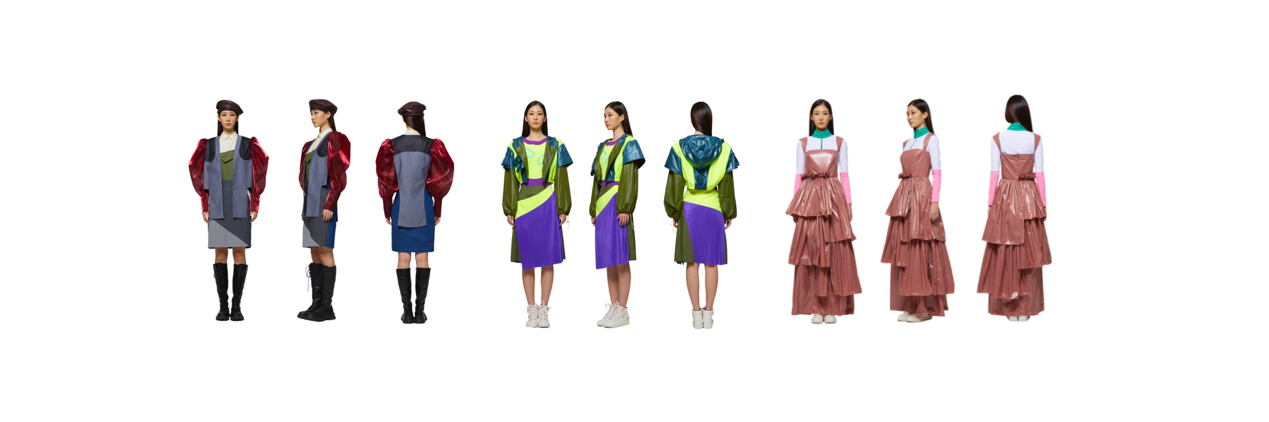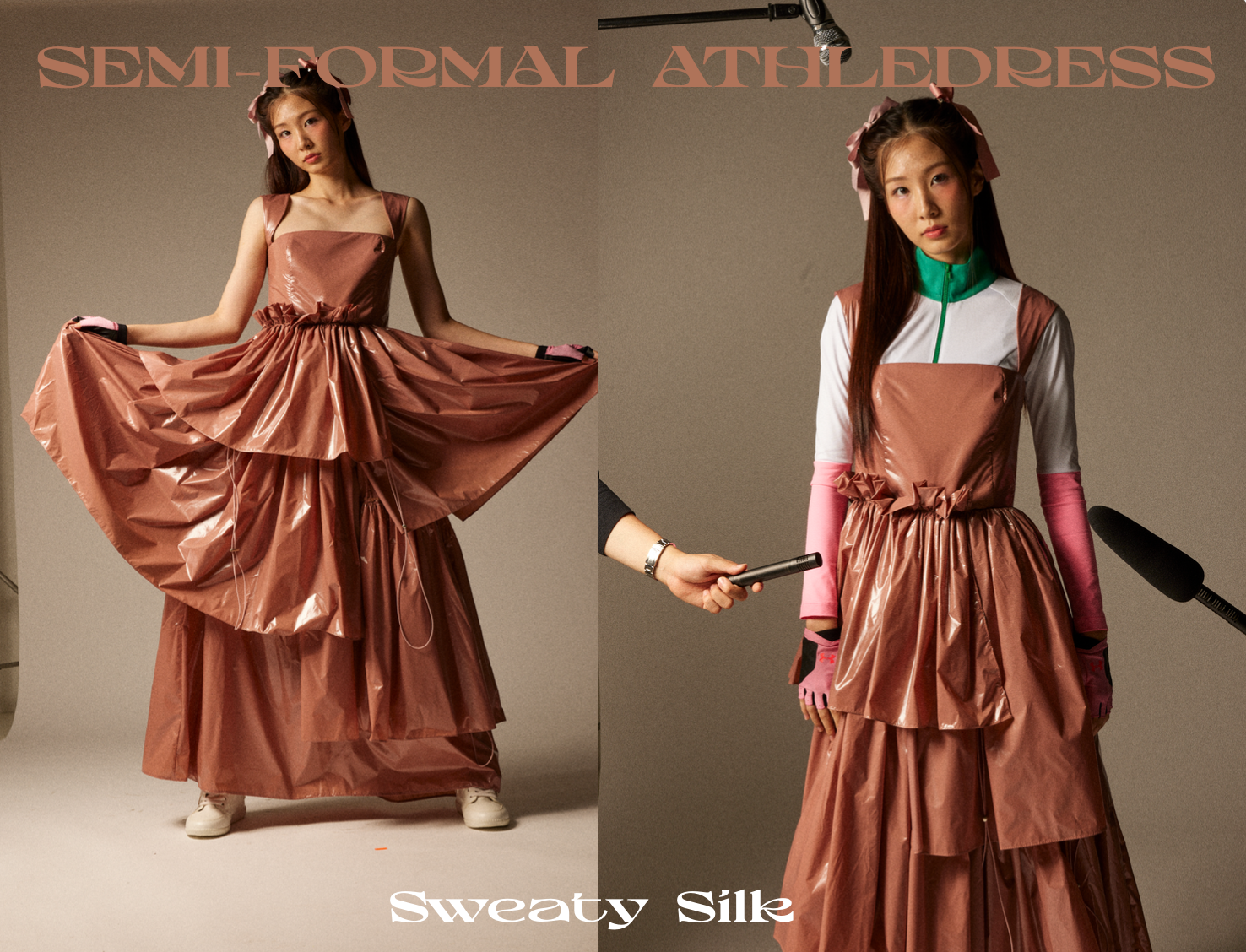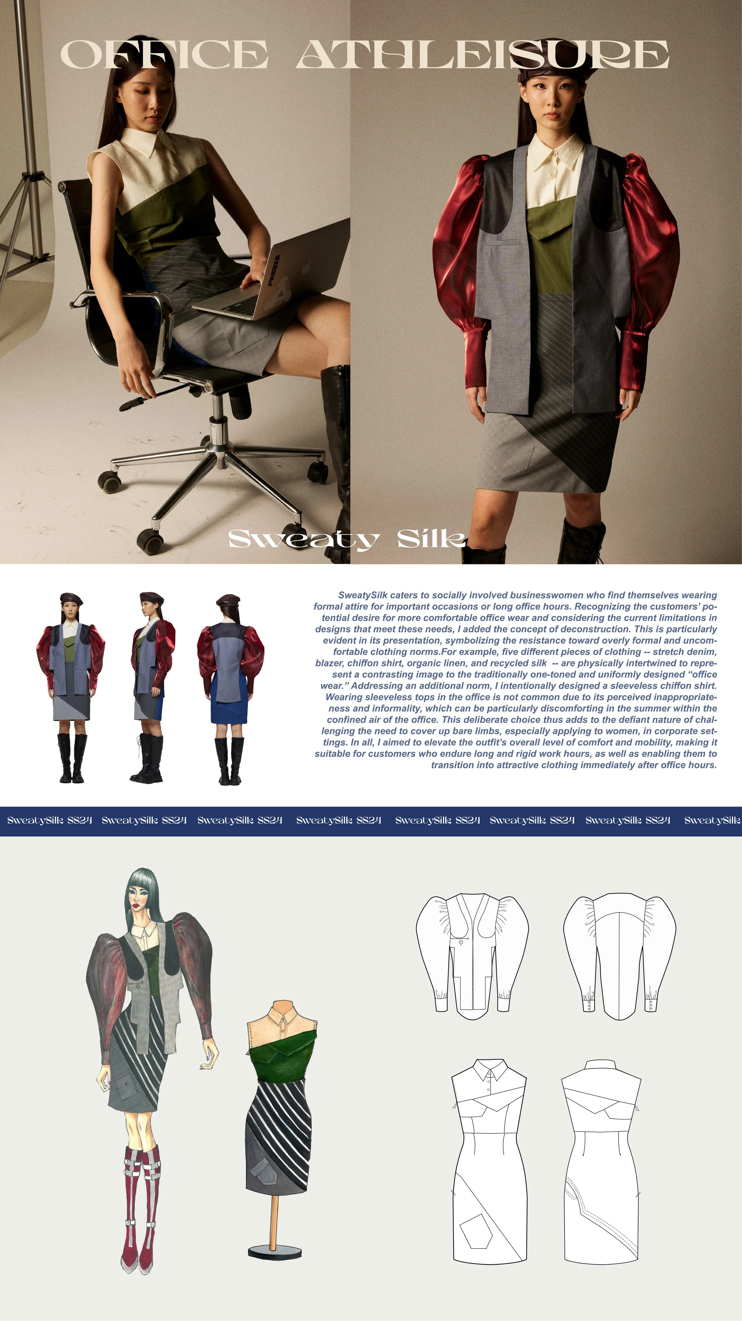 SweatySilk caters to socially involved businesswomen who often find themselves wearing formal attire for important occasions or long office hours. Recognizing the customers’ potential desire for more comfortable office wear and considering the current limitations in designs that meet these needs, I added the concept of deconstruction in every aspect of this clothing. This is particularly evident in its presentation, symbolizing the resistance toward overly formal and uncomfortable clothing norms.